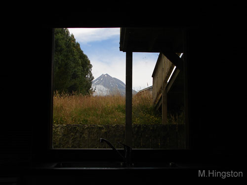Majestic Mount Taranaki looms through the early morning’s clouds.